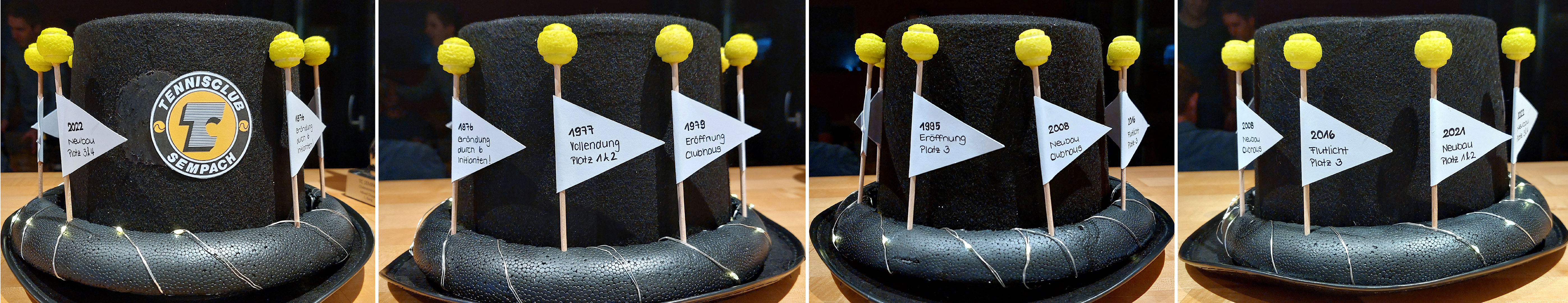 Der Anlass stand unter dem Motto "Mut zum Hut" und die Anwesenden liessen sich nicht lumpen, denn alle hatten einen Hut dabei. Einige haben wohl Stunden investiert, um mit dem Hut Tennis-Geschichte zu dokumentieren. Hier stachen vor allem die Hüte von Julia Weingartner sowie Ruth und Kurt Krieger hervor. Während Julia die Entwicklungsgeschichte des TC Sempach auf ihrem Hut verewigte, dokumentierten Ruth und Kurt die besten Tennisspieler:innen im Profi-Tennis. Einen ganz lustigen Hut präsentierte Hansi Burri, auf dessen Kopf ein gerupftes Huhn seine Flügel und Schenkel in verschiedenen Rhythmen auf Knopfdruck bewegte. Bei der Prämierung der besten Hüte durch die Anwesenden gab es folgendes Podest: