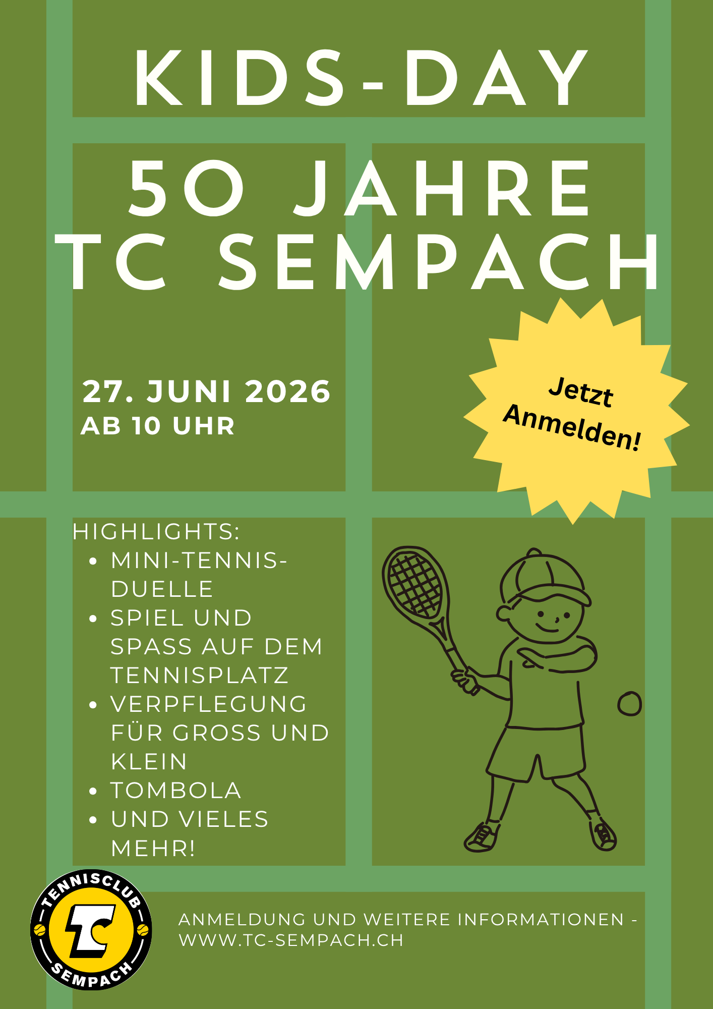 Wir freuen uns sehr, euch am 27. Juni 2026 am Kids-Day im Tennisclub Sempach willkommen zu heissen.